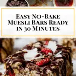 These 5-Ingredient No-Bake Muesli Bars are a quick, healthy, and delicious snack perfect for on-the-go. Ready in just 30 minutes, they combine nutritious muesli with coconut oil and natural sweeteners, no baking required. Optionally topped with a smooth dark chocolate drizzle and flaky sea salt, these bars are perfect for a wholesome treat any time of the day.
