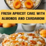 This Apricot Cake made with fresh apricots is a tender, moist dessert featuring a fragrant blend of cardamom, almond, and vanilla extracts. The cake is enriched with full-fat sour cream and studded with fresh apricots on top, sprinkled with sliced almonds for a delightful crunch. Perfect for spring and summer, this beautifully baked cake showcases the natural sweetness and slight tartness of fresh apricots in a delicate crumb.