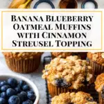 Deliciously moist and wholesome Banana Blueberry Oatmeal Muffins featuring ripe bananas, fresh blueberries, and a crunchy cinnamon streusel topping. Perfect for breakfast or a healthy snack, these muffins combine the heartiness of rolled oats with the sweet and tangy flavors of fruit in every bite.