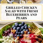 A fresh and flavorful Blueberry Grilled Chicken Salad featuring tender marinated chicken breast, sweet blueberries, crisp pears, savory bacon, and creamy goat cheese, all tossed in a homemade blueberry vinaigrette for a perfect balance of sweet and savory in every bite.