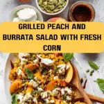 A refreshing and vibrant Burrata Peach Salad featuring grilled corn, creamy burrata cheese, toasted pepitas, and fresh basil, all brought together with a tangy balsamic vinaigrette. Perfect for a light and elegant summer meal or appetizer.