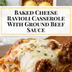 This easy baked ravioli recipe combines ground beef, marinara sauce, and cheese for a comforting and delicious casserole that’s perfect for a hearty family meal. With layers of frozen cheese ravioli and a creamy tomato meat sauce, topped with melted mozzarella, this dish is simple to prepare and bakes to golden perfection in just one hour.