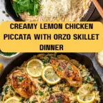 Chicken Piccata Orzo is a creamy, tangy one-pan meal featuring tender chicken cutlets seared to golden perfection, served with orzo pasta cooked in a luscious lemon-caper cream sauce with garlic, spinach, and Parmesan. This quick 30-minute dish balances bright lemon flavors with the richness of cream and butter, making it a satisfying, elegant dinner for four.