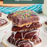 - Decorate the crackers: Drizzle the white and extra chocolate over the dipped crackers in decorative patterns. Add sprinkles on top if you like for a festive touch.