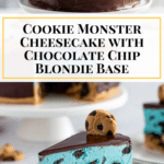 This Cookie Monster Cheesecake combines a rich chocolate chip cookie blondie base with a vibrant blue cookies and cream cheesecake layer, topped with a luscious chocolate ganache and decorated with mini chocolate chip cookies. Perfect for cookie lovers and cheesecake enthusiasts alike, this visually striking dessert is sure to be a showstopper at any gathering.