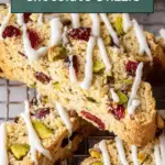 - Drizzle white chocolate: Drizzle the melted white chocolate over the cooled biscotti. Optionally garnish with extra chopped pistachios and dried cranberries for presentation and extra flavor.