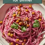 Serve this dazzling pasta in wide, shallow bowls to show off the gorgeous beetroot color and the crispy chickpea topping. For a festive touch, add edible flowers or microgreens. You can also make it a fun interactive meal by serving the chickpeas separately for guests to sprinkle on themselves, preserving their crunch until the very last bite.