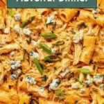 A flavorful and creamy buffalo chicken pasta that combines tender rigatoni with a spicy buffalo cream sauce, shredded rotisserie chicken, cheddar cheese, and garnished with green onions and crumbled blue cheese. Perfect for a quick and satisfying meal in just 30 minutes.