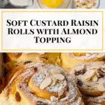 Custard Raisin Rolls are soft, fluffy yeast rolls filled with creamy homemade custard and raisins, topped with crunchy almond flakes and a light dusting of powdered sugar. These sweet rolls combine a tender dough with rich custard filling, perfect for breakfast, brunch, or an indulgent snack.