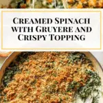 This Easiest Creamed Spinach with Gruyere is a rich, creamy side dish featuring tender spinach, a flavorful cream sauce infused with mustard, nutmeg, and garlic, all topped with a crispy, buttery panko and thyme breadcrumb crust. Ready in 30 minutes, it’s perfect for weeknight dinners or holiday meals and serves 8.