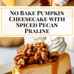 This Easy No Bake Pumpkin Cheesecake is a creamy, spiced delight perfect for autumn and holiday gatherings. With a buttery graham cracker crust, luscious pumpkin-cream cheese filling stabilized with gelatin, and a rich pecan praline sauce topping, this cheesecake requires no oven baking and is chilled to perfection. It’s beautifully decorated with whipped cream and turbinado sugar for a stunning presentation and a deliciously smooth texture that melts in your mouth.