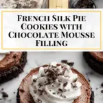 Indulge in these decadent French Silk Pie Cookies, which combine rich black cocoa and Oreo crumbs in a tender cookie base with a luscious chocolate mousse filling. These cookies feature a unique lip to hold the mousse, topped with whipped cream and chocolate shavings, perfect for an elegant dessert or special treat.