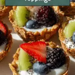 This is the fun part! Spoon your favorite yogurt into each granola cup, filling the hollow centers you created earlier. Then top with fresh fruit like berries or sliced bananas and sprinkle with chia seeds for that final boost of nutrition and crunch. The combination of creamy, crunchy, sweet, and fresh is absolutely irresistible.