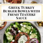 These Greek Turkey Burger Bowls with Tzatziki are a flavorful and healthy meal combining juicy ground turkey patties seasoned with Mediterranean herbs and spices, served atop a vibrant salad of romaine, tomatoes, cucumbers, olives, and feta cheese, finished with creamy tzatziki sauce and a zesty red wine vinaigrette. Perfect for a light, nutritious lunch or dinner, this recipe offers a fresh take on the classic burger bowl with easy stovetop cooking and quick preparation.