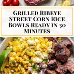 This Grilled Street Corn Steak Rice Bowls recipe combines smoky, juicy ribeye steaks with a creamy and zesty street corn salad served atop fluffy rice. Perfect for a quick and flavorful 30-minute meal, it features charred corn kernels mixed with mayo, feta, cotija cheese, and fresh herbs, creating a vibrant and satisfying dish inspired by Mexican street food flavors.