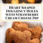 - Serve: Arrange the coated heart-shaped doughnut holes on a serving plate alongside the strawberry cream cheese dip. Enjoy the sweet, cinnamony doughnuts dipped into the smooth, fruity cream cheese sauce.