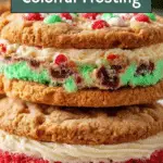These festive sandwich cookies are loaded with holiday M&M’s, mini chocolate chips, and sprinkles, baked to golden perfection and filled with a colorful, fluffy buttercream frosting in red, green, and white. Perfect for holiday celebrations, this fun and delicious treat combines classic chewy cookies with a creamy, festive filling.