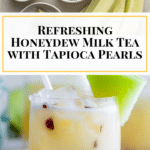A refreshing and lightly sweetened Honeydew Milk Tea featuring green tea, tapioca pearls infused with maple syrup, blended honeydew melon, and creamy almond milk. Perfect for a cool, energizing treat on a warm day.
