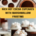 These Hot Cocoa Cupcakes are rich, moist chocolate treats infused with peppermint schnapps and topped with a fluffy marshmallow frosting. The intense cocoa flavor combined with the creamy marshmallow buttercream makes for a perfect winter dessert or cozy treat that embodies the classic taste of hot cocoa in cupcake form.