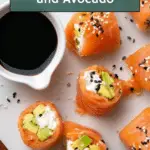 Delicious and low-carb Keto Sushi Rolls featuring smoked salmon, creamy avocado, fresh cucumber, and cream cheese, garnished with black and white sesame seeds. These sushi rolls are easy to prepare without rice, making them perfect for keto and low-carb diets. Serve with soy sauce or tamari for an authentic sushi experience.