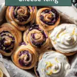 Whip together cream cheese, softened butter, confectioner’s sugar, vanilla extract, lemon juice, and lemon zest until fluffy and smooth. This icing is the crowning glory of the Lemon Blueberry Sweet Rolls Recipe — creamy, tangy, and just sweet enough.