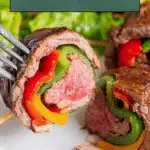 Remove the steak from the marinade and cut into 6 to 7 equal pieces. Lay each piece flat and place an even amount of sliced green and red bell peppers along with onions in the center. Roll each steak piece tightly around the vegetables and secure it with toothpicks to hold everything together.