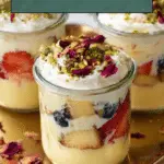 Mini Fruit Custard Trifle Cups are delightful layered desserts featuring fresh strawberries and blueberries, creamy homemade custard infused with cardamom and saffron, tender pound cake pieces, and a fluffy whipped cream topping. Garnished with pistachios and optional dried rose petals, these elegant trifles are perfect for parties or a refreshing treat.