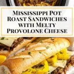 Tender, flavorful Mississippi Pot Roast slow-cooked to perfection and served on toasted sourdough or hoagie rolls with provolone cheese and pepperoncini peppers, making the ultimate hearty sandwich perfect for any occasion.