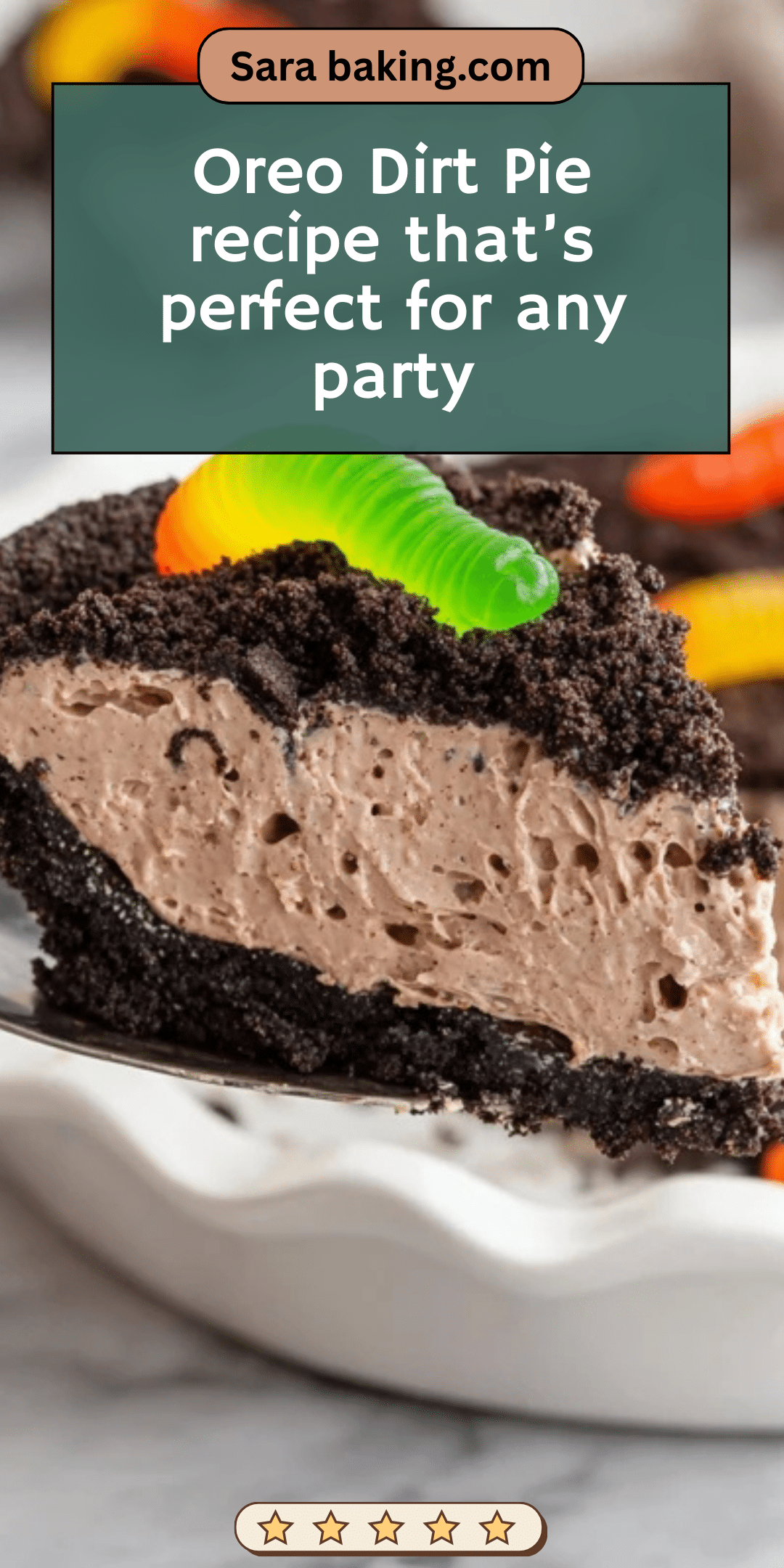 - Add the Topping: Just before serving, sprinkle the remaining ½ cup Oreo cookie crumbs over the top of the pie and decorate with 8-10 gummy worms to mimic dirt and worms.