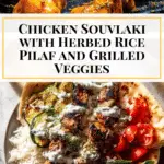 This Quick Chicken Souvlaki Rice Pilaf recipe combines tender, flavorful grilled chicken skewers marinated in a vibrant blend of herbs and spices, served alongside a buttery, nutty basmati rice and orzo pilaf. Accompanied by grilled vegetables, fresh cherry tomatoes, crumbled feta, and cool tzatziki, this Mediterranean-inspired dish is perfect for a satisfying weeknight dinner or a casual gathering.