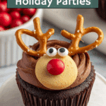 Delightfully festive Reindeer Cupcakes perfect for holiday celebrations, featuring moist Devil’s Food cake infused with instant chocolate pudding and chocolate chips, topped with rich cocoa frosting and decorated with pretzels, vanilla wafers, candy eyes, and red M&Ms to create adorable reindeer faces.