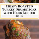 This recipe for roasted turkey drumsticks delivers tender, flavorful dark meat with perfectly crisped skin. The turkey is seasoned with a blend of classic herbs and spices, coated with a butter and olive oil rub, and slow-roasted to ensure juicy, moist meat. Finished under the broiler for a golden, crispy exterior, these drumsticks make an ideal hearty meal for two.
