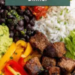 - Assemble the Bowl: In each serving bowl, add a base of cooked jasmine rice, then top with sliced steak, sautéed veggies, black beans, guacamole, salsa, and any optional additions. Serve immediately and enjoy.