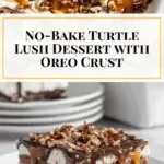 Turtle Lush is a decadent no-bake layered dessert featuring a crunchy Oreo crumb crust, a creamy sweetened cream cheese layer topped with chopped pecans, followed by rich chocolate pudding and fluffy whipped topping. Finished with drizzles of caramel and chocolate sauce and a pecan garnish, this crowd-pleasing treat is chilled for several hours to achieve a luscious, indulgent texture ideal for gatherings and celebrations.