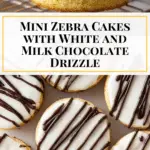 16. Drizzle Milk Chocolate: Transfer the melted semi-sweet chocolate into a ziplock bag, snip a small corner, and drizzle a zebra pattern over the white chocolate coating on each cake.